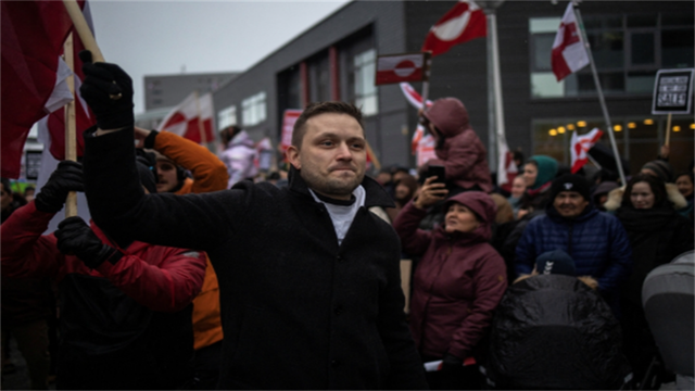 (格陵兰岛自治政府总理尼尔森亲自走在抗议队伍前列,抗议美国夺取格陵兰岛的行径)