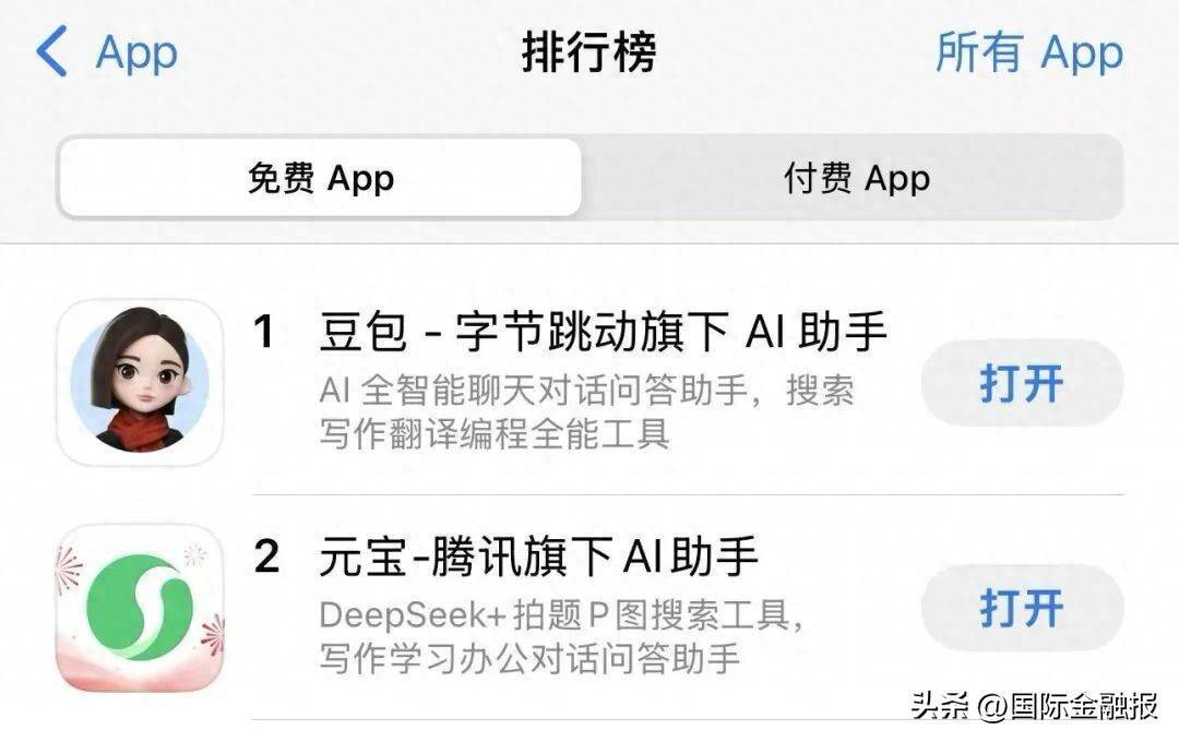 彼时,DeepSeek引爆科技圈,并在2025年春节期间吸引大量用户下载。随后,宣布接入满血版DeepSeek-R1后的腾讯元宝热度快速上升,在苹果应用商店的排行榜上接连超越豆包和DeepSeek,登顶榜首。